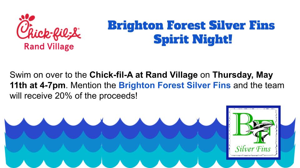 Please join us Thursday, May 11th from 4-7 PM at Rand Village Chick-fil-A in support of the Silver Fins. Mention the Brighton Forest Silver Fins when making a purchase in the store or drive-thru and 20% of the proceeds will be donated to the team.